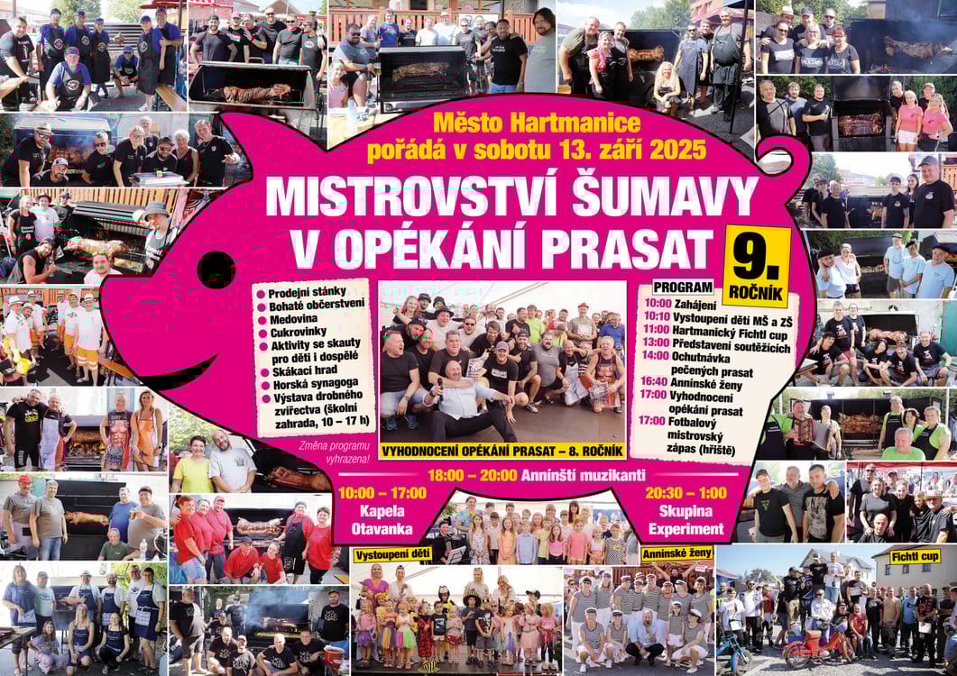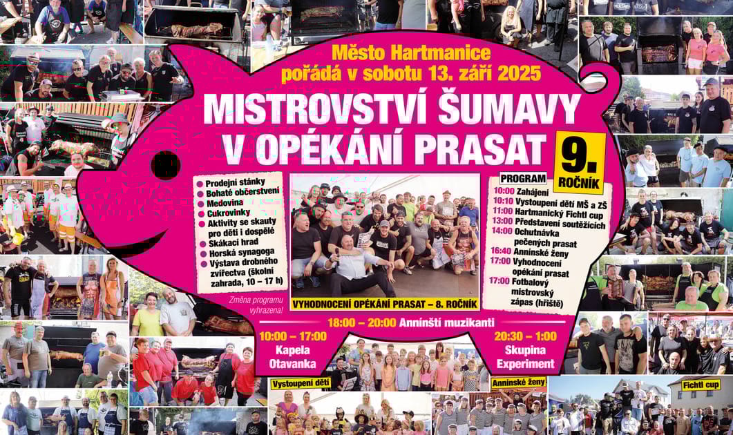 Město Hartmanice pořádá 13.09.2025 před hotelem Vintíř již 9.ročník Mistrovství Šumavy v opékání prasat. Přijďte ochutnat od 18 soutěžících jejich pečínku. Po celý den je připraven kulturní program. Hudba k poslechu i tanci Otavanka, Aninští muzikanti, kapela Experiment.
