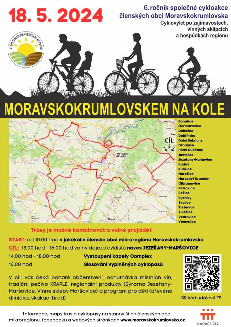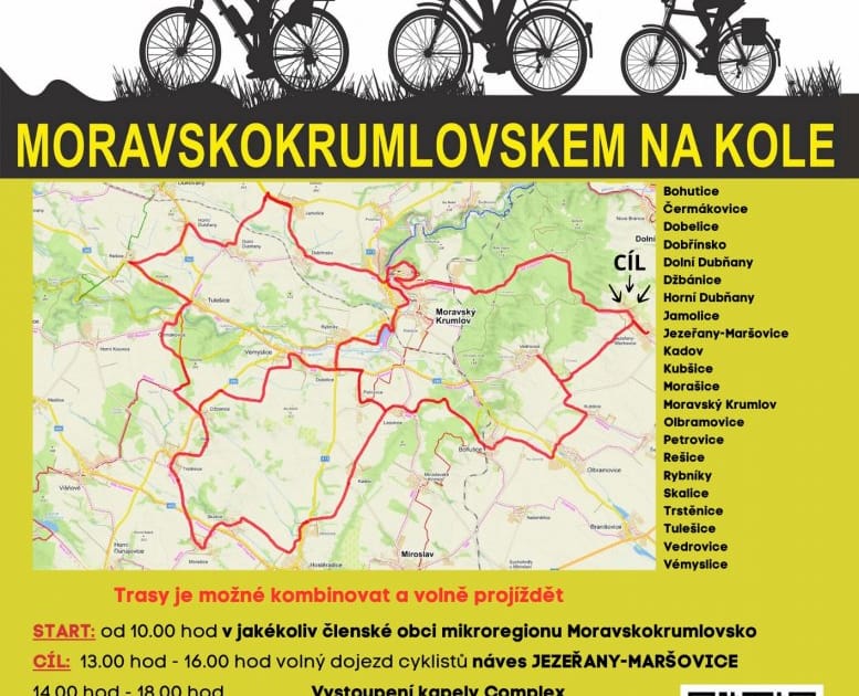 Už 6. ročník společné akce členských obcí mikroregionu Moravskokrumlovsko – cyklistický výlet po zajímavostech, vinných sklípkách a hospůdkách regionu. Letošní cíl oblíbené cykloakce je na návsi v Jezeřanech-Maršovicích, kde od 14 hod. bude připraven doprovodný program, hudební vystoupení, občerstvení i s regionálními produkty, ochutnávky vína a od 16 hod. i tradiční slosování startovních pasů. Startovat můžete z kteréhokoliv místa po trase.