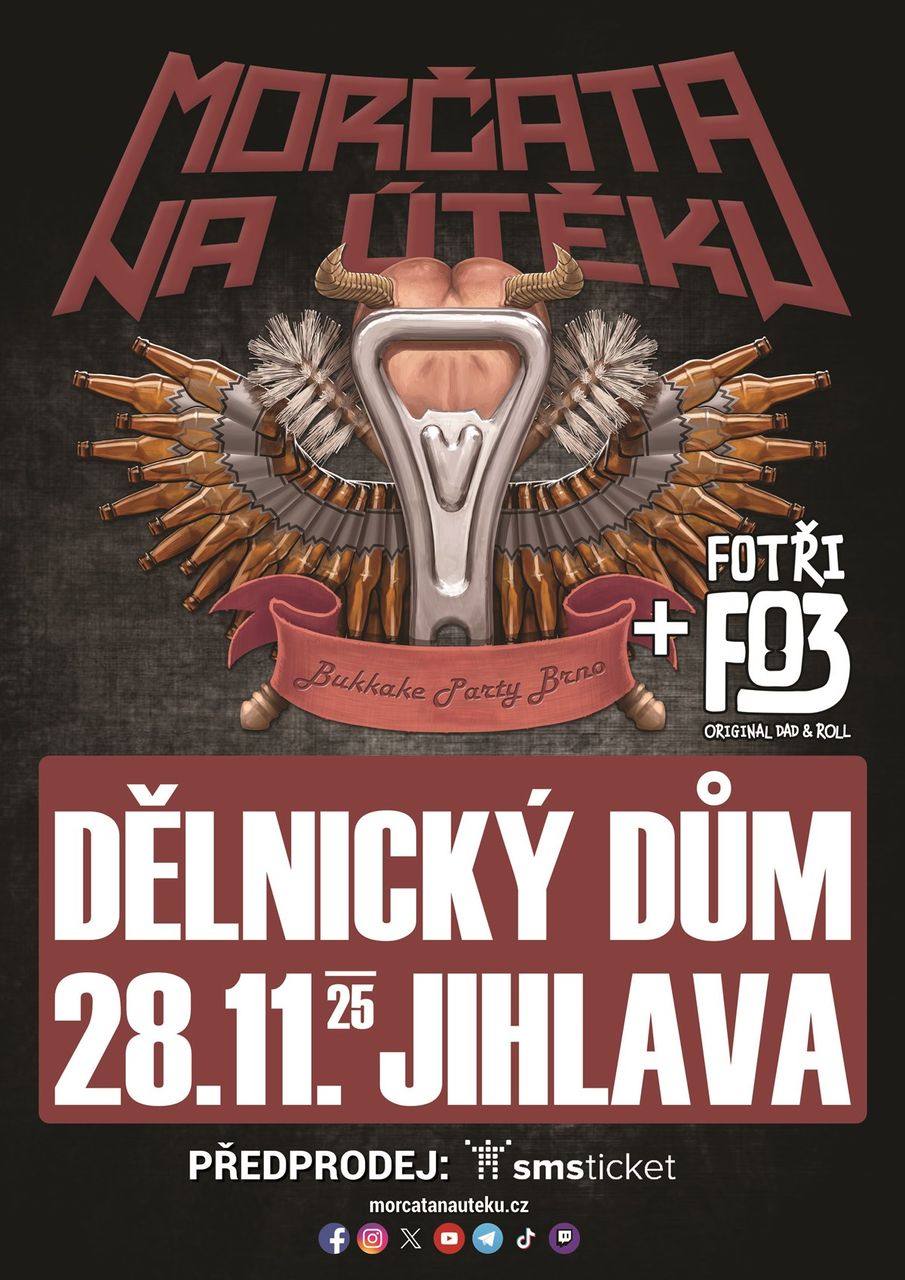 Do Dělňáku se opět vrací partička brněnských humoristů Morčata na útěku s další dávkou osobité show. Tentokrát k sobě přibrali kolegy z kapely Fo3 (Fotři) kloubící rock’n’roll s otcovstvím.