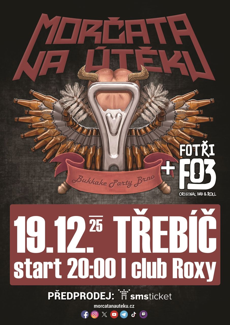 Tradiční vánoční setkání s Morčaty na útěku v třebíčském klubu Roxy. Tentokrát s sebou přivezou budějovickou kapelu Fo3 (Fotři), kteří kloubí otcovství rock’n’rollem…