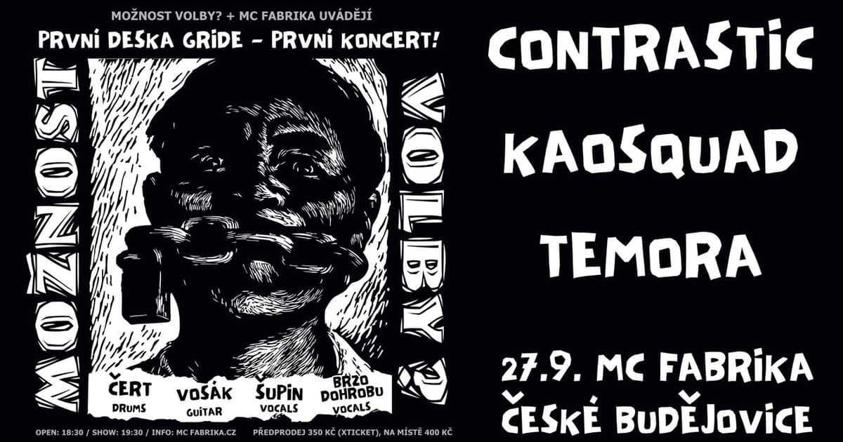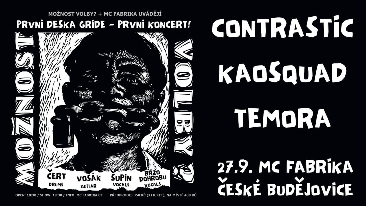 Zakládající člen a bubeník Čert spojil síly s dalšími matadory hardcore/grindcore scény (Vosák a Šupin z LYCANTHROPHY a Brzo DoHrobu z LADY GAZA) a nazkoušeli kompletní první desku Gride s názvem Možnost Volby?. O víkendu natočili dvě ukázky (můžeš už teď vidět a slyšet – odkaz lítá všude) a rozhodli se domluvit pár speciálních koncertů na počest tohoto alba. Chceš slyšet tuhle kultovní desku živě v této raritní sestavě? Možností moc nebude a jedna z nich je právě v pátek 27.9. v českobudějovické Fabrice, navíc ve společnosti hodně speciálních hostů, kterými jsou legendární CONTRASTIC, blatenští zabijáci KAOSQUAD a domácí čerstvá krev TEMORA!!! Tady zkrátka nesmíš chybět.
