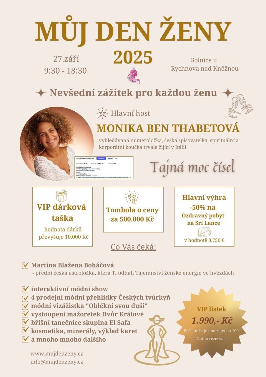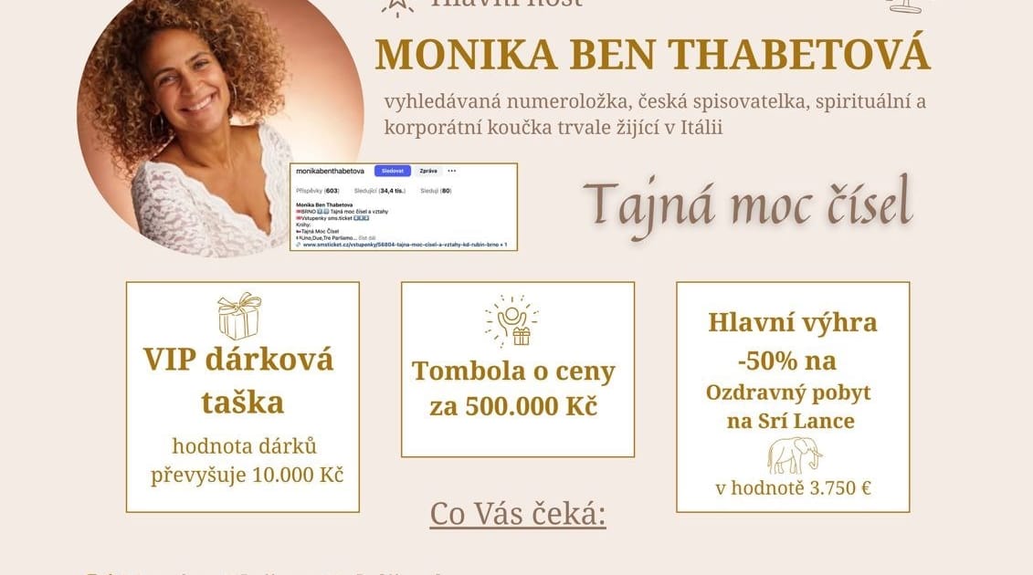 Welcome prosecco, Přednášky, Numerologie – Monika Ben Thabetová, Astrologie – Martina Blažena Boháčová, Interaktivní modní show, Líčení a kosmetika, Numerologie a výklad karet, Mandaloterapie, Minerální kameny, Feng-Shui doplňky, Workshopy, Bohatá tombola v hodnotě 500.000,- hlavní výhra 50% sleva na 21 denní Ayurvéda pobyt na Srí Lance v hodnotě 45.000,-
