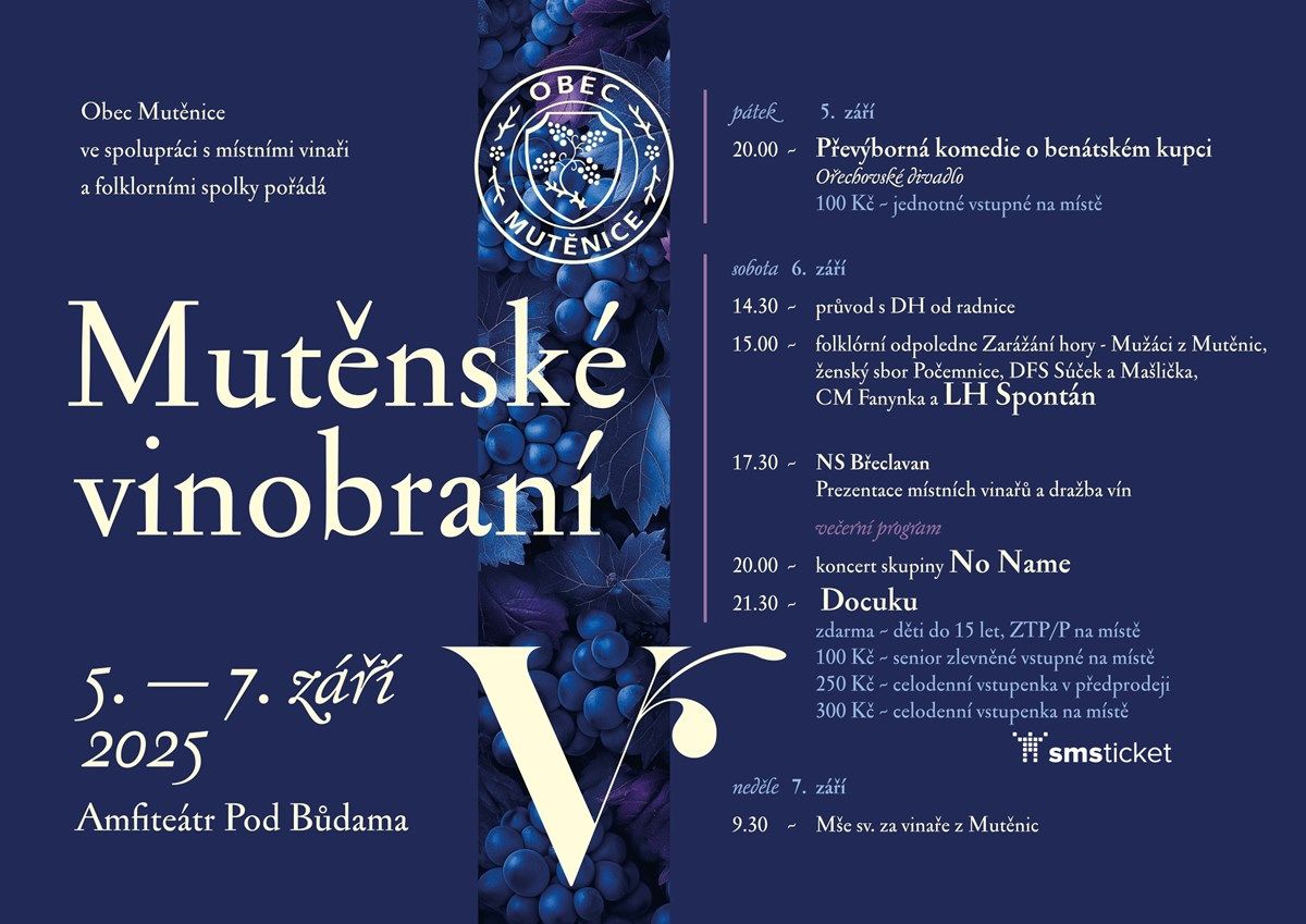 Tradiční slavnosti vína v Mutěnicích nabídnou pestrý program plný folkloru, hudby a vína. Těšit se můžete na průvod s dechovou hudbou, folklorní vystoupení, dražbu vín, koncerty skupin No Name a Docuku a divadelní představení Ořechovského divadla.