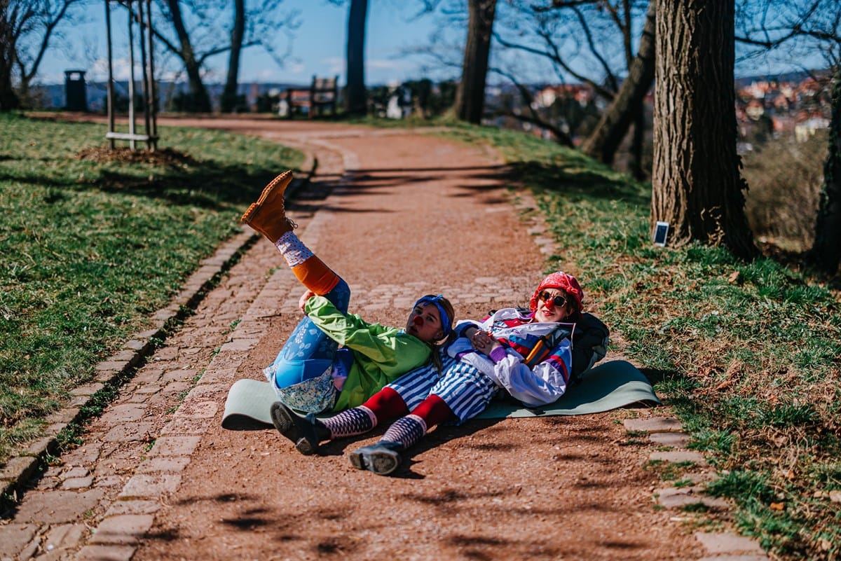 Dvě klaunky, nastražený kabel, batoh, detektivka, vražda, balvan, bobek, počítač a láska. Humor, interakce, zpěv a čaj. Čaj? Kafe!