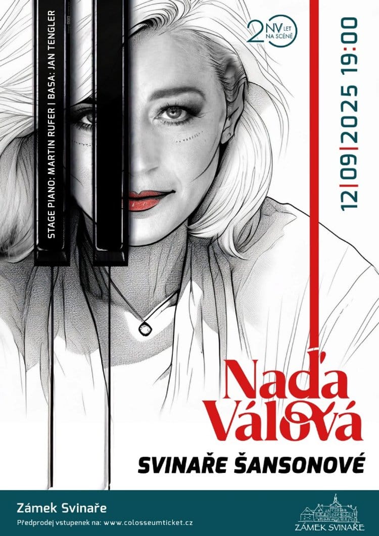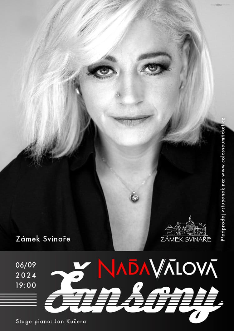 Koncert stálice šansonové scény a přední interpretky písní autorské dvojice Hapka/ Horáček Nadi Válové za doprovodu klavíru skvělého Martina Rufera. A basy výborného jazzového hudebníka Jana Tenglera. Opět na mimořádném místě zámku Svinaře.