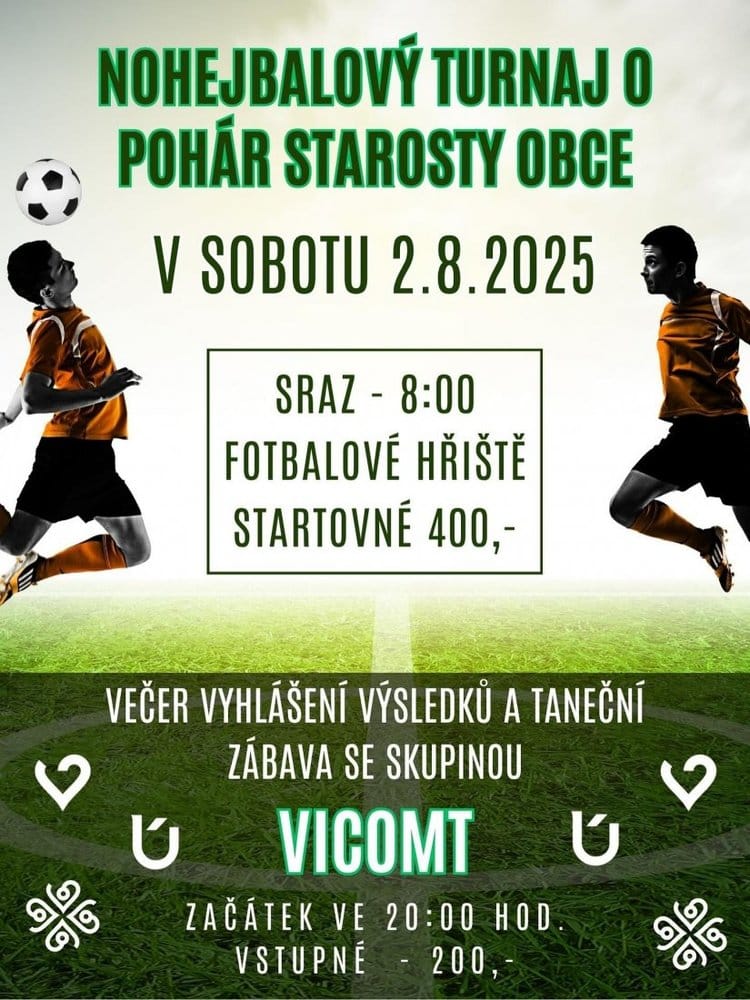 Sportovní výkony společně s hudbou a tancem si můžete vychutnat na fotbalovém hřišti v Únanově. Nohejbalový turnaj bude zahájen již v 8 hod. prvními zápasy. Od 20 hod. večer pak bude společně s vyhlášením sportovních výsledků zahájena taneční zábava s kapelou VICOMT.