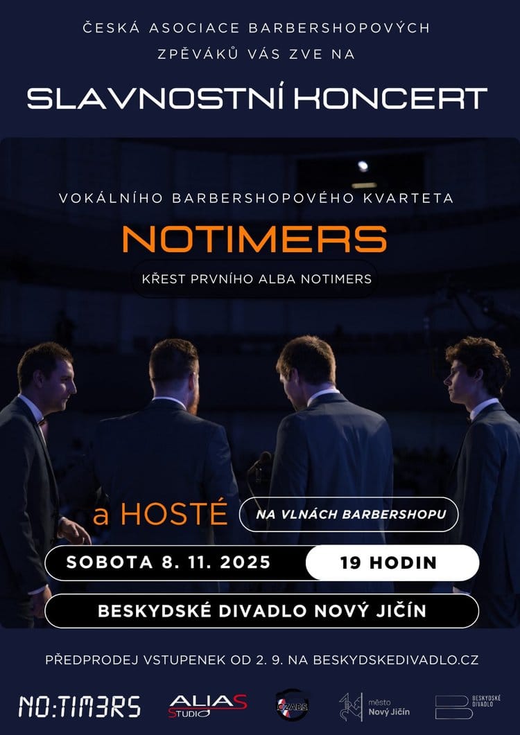 Publikum v Beskydském divadle čeká křest prvního alba NoTimers. Vokální kvartet NoTimers, momentálně nejdéle působící barbershopový kvartet v Česku, byl založen z výběru nepočetné mužské sekce novojičínského Smíšeného komorního sboru Ondrášek.