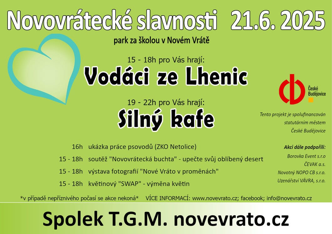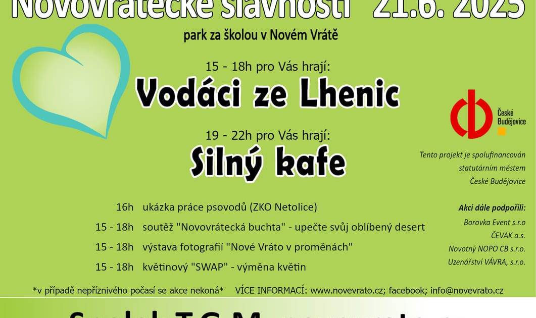 Novovrátecké slavnosti se konají poprvé. V případě příznivého počasí se můžete těšit na hudební vystoupení country kapely Vodáci ze Lhenic (15 – 18h) a kapely Silný kafe (19 – 22h).