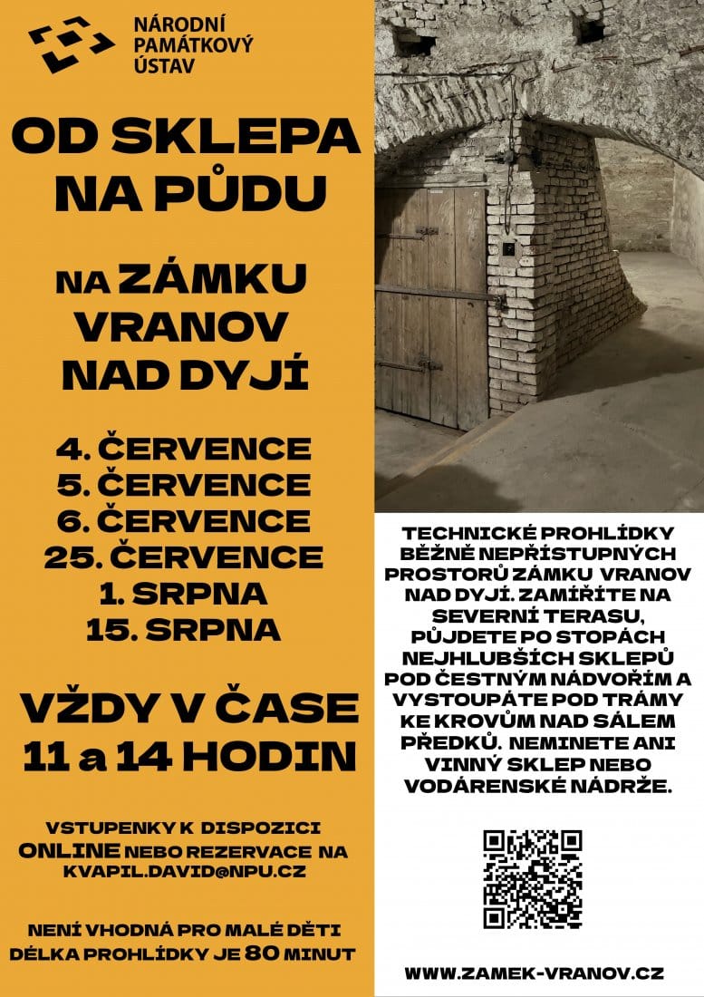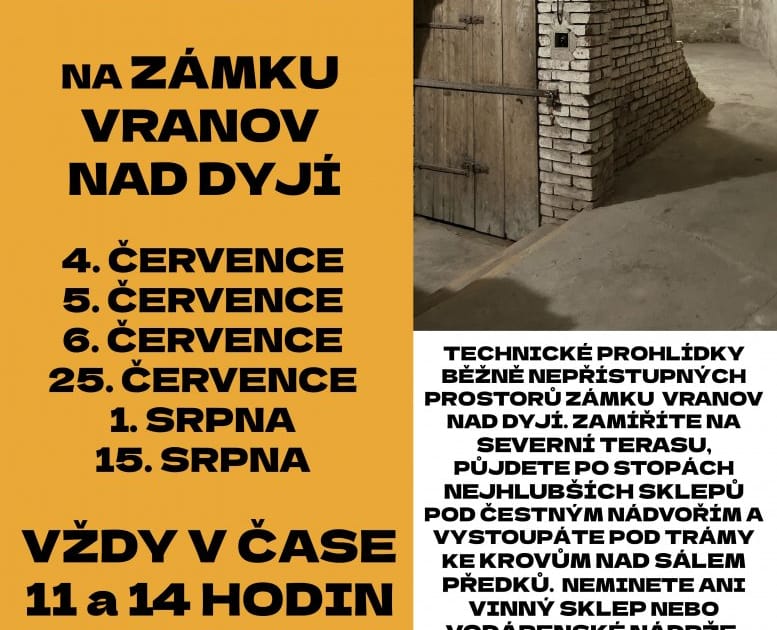 Na netradiční letní prohlídku veřejnosti běžně nepřístupných prostor zve barokní zámek ve Vranově nad Dyjí. Projdete zámecký areál tak, jako nikdy předtím – od nejhlubších středověkých sklepů pod čestným dvorem až k nedávno obnoveným střešním krovům nad monumentálním Sálem předků. Speciální technická prohlídka ukáže místa, která jsou obvykle návštěvníkům skrytá, jako např. prostor pod Sálem předků s vodárenskými nádržemi.