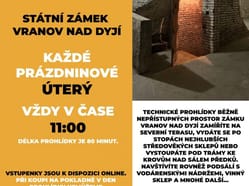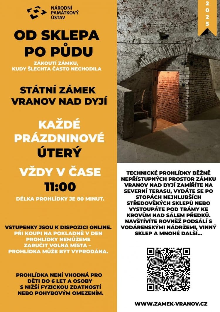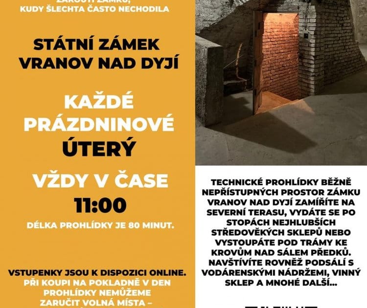 Na netradiční letní prohlídku veřejnosti běžně nepřístupných prostor zve barokní zámek ve Vranově nad Dyjí. Projdete zámecký areál tak, jako nikdy předtím – od nejhlubších středověkých sklepů pod čestným dvorem až k nedávno obnoveným střešním krovům nad monumentálním Sálem předků. Speciální technická prohlídka ukáže místa, která jsou obvykle návštěvníkům skrytá, jako např. prostor pod Sálem předků s vodárenskými nádržemi.