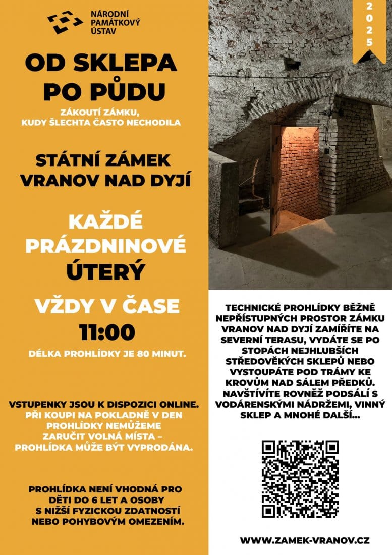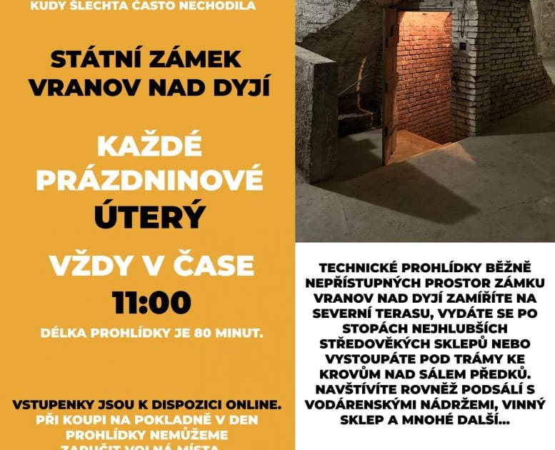 Na netradiční letní prohlídku veřejnosti běžně nepřístupných prostor zve barokní zámek ve Vranově nad Dyjí. Projdete zámecký areál tak, jako nikdy předtím – od nejhlubších středověkých sklepů pod čestným dvorem až k nedávno obnoveným střešním krovům nad monumentálním Sálem předků. Speciální technická prohlídka ukáže místa, která jsou obvykle návštěvníkům skrytá, jako např. prostor pod Sálem předků s vodárenskými nádržemi.
