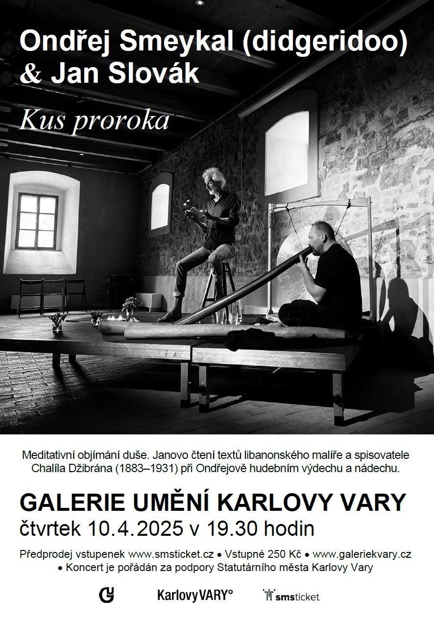 Komponovaný večer s hudbou našeho nejlepšího hráče na australský domorodý nástroj Ondřeje Smeykala, který dokáže z didgeridoo vykouzlit mnohobarevné hudební plochy nezaměnitelného a tajemně krásného zvuku. Během let vypracoval svou techniku do obdivuhodné virtuozity a preciznosti, jeho osobitý výrazně dynamický styl hry vytváří bohatý hudební projev (na koncertech obohacený i o zvuky gongu a hodinových strojků). Neobyčejnou a vtahující muziku doplní přednes Jana Slováka, autora, divadelního a filmového herce (např. Kouř), protagonisty divadla Sklep a performerského dua Thomas&Ruhller. Zazní texty libanonského křesťanského malíře, básníka a spisovatele Chalíla Džibrána (1883–1931), který se proslavil knihou básnivých esejů nazvanou Prorok, vydanou v roce 1923 a přeloženou již do více než sta jazyků. Na nevšední hudebně poetický večer, jste zváni ve čtvrtek 10.4.2025 v 19.30 hodin.