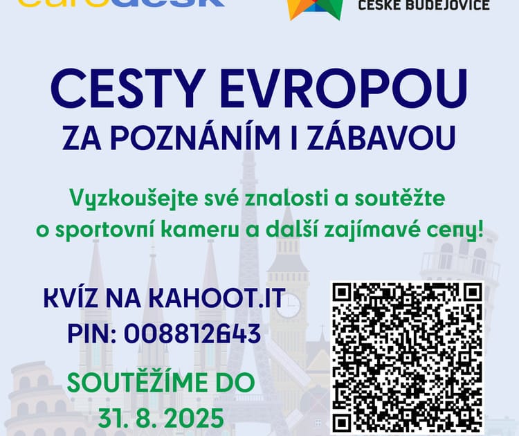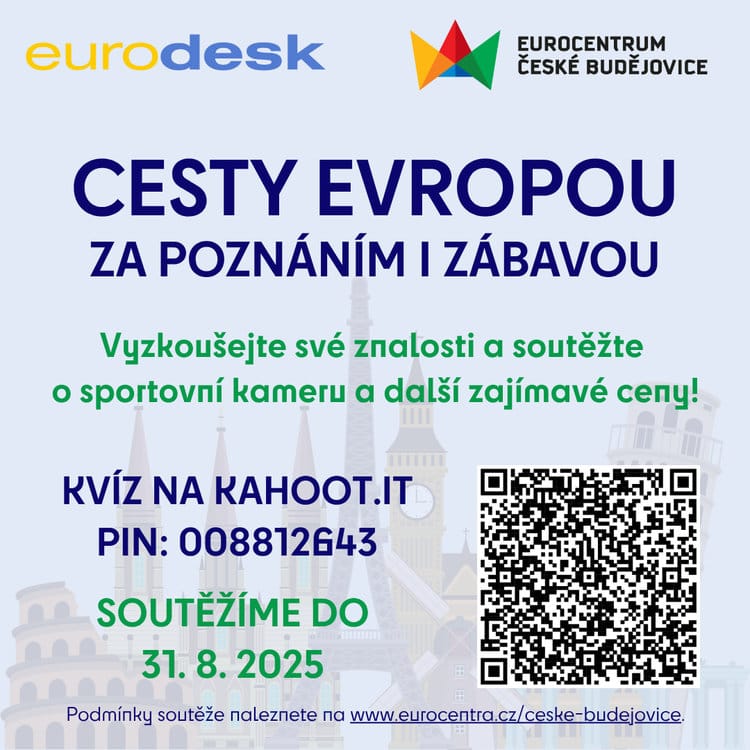 Vyzkoušejte si v online kvízu, co víte o cestování po Evropě a o programech Evropské unie, přes které můžete získat finanční podporu na své cesty (podpora pro mladé ve věku 13-30 let). Kvíz je možné vyplnit do 31. 8. 2025. Vyhrát můžete zajímavé ceny, např. sportovní kameru.