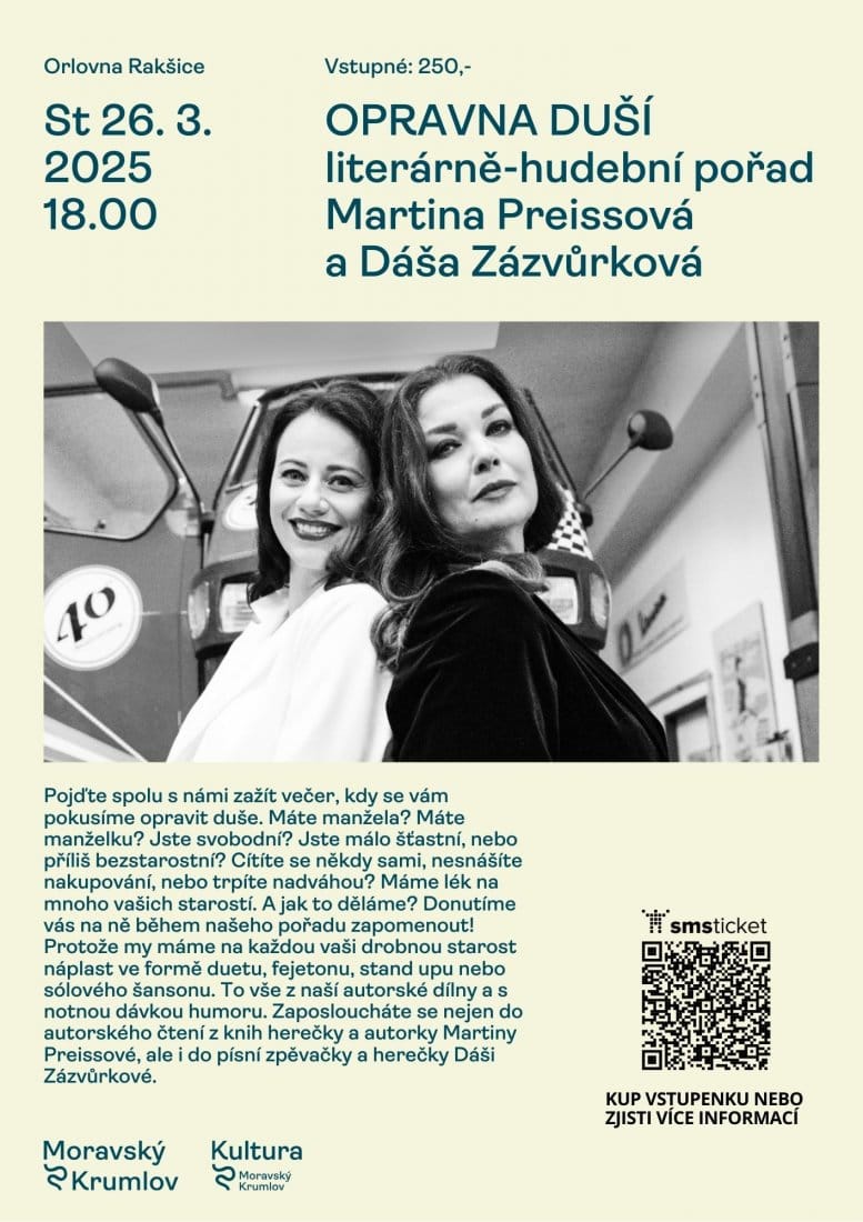 Autorské představení dvou inspirativních žen: herečky a spisovatelky Martiny Preissové a zpěvačky a herečky Dáši Zázvůrkové. Uslyšíte povídky z knížek „Jak jsem nebyla na lvech“ a „Mají v nebi skleničky?“, které vám přečte sama autorka, a uslyšíte písničky, které Vás strhnou svým rytmem. Od 18 hod. vás v Orlovně v moravskokrumlovských Rakšicích čeká představení, které má na vaše vlastní starosti účinnou náplast ve formě duetu, fejetonu, stand upu nebo sólového šansonu. Cestou domů si ještě budete zpívat a usmívat se…