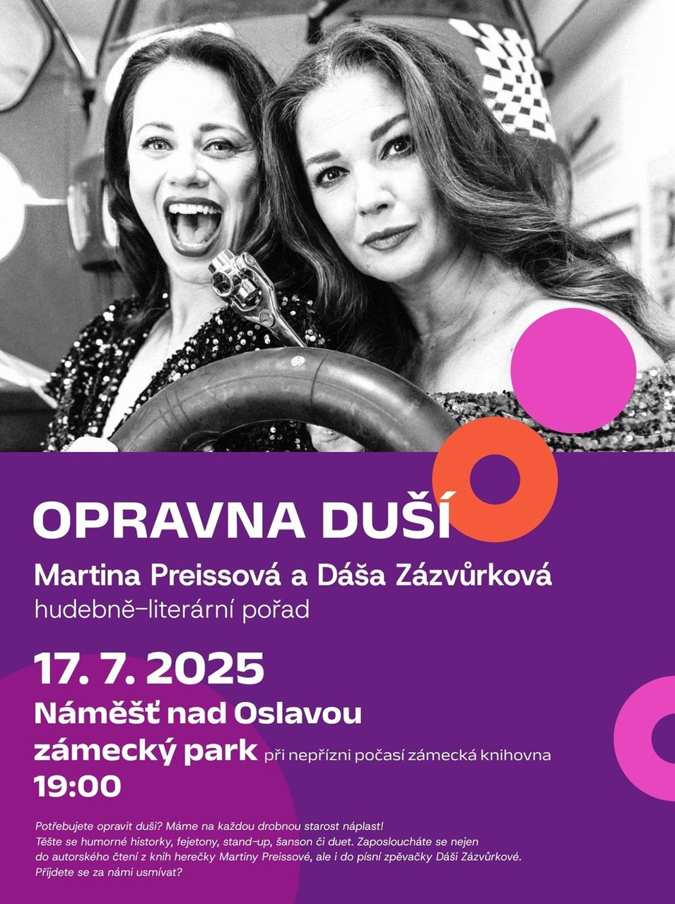 Pojďte spolu s námi zažít večer, kdy vám opravíme vaše duše! Literárně-hudební show „Opravna duší“ vytvořily herečka a spisovatelka Martina Preissová a zpěvačka a herečka Dáša Zázvůrková. Tento projekt spojuje autorské čtení z knih Martiny Preissové „Jak jsem nebyla na lvech“ a „Mají v nebi skleničky?“ s hudebními vystoupeními Dáši Zázvůrkové.