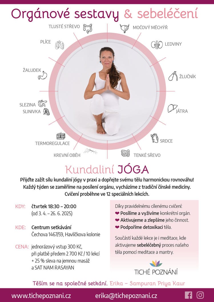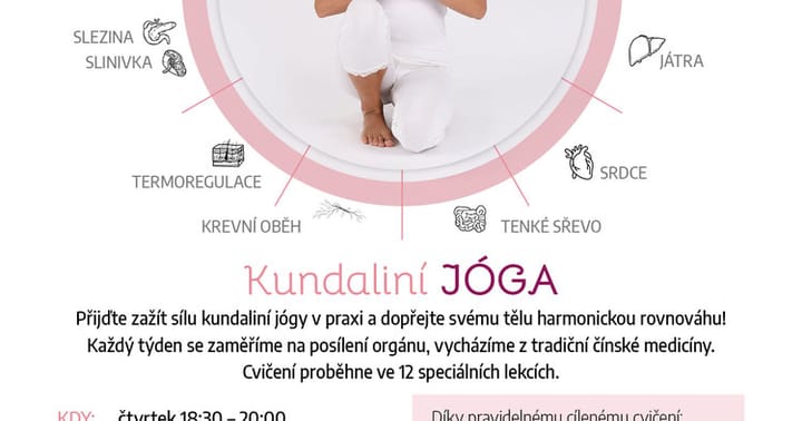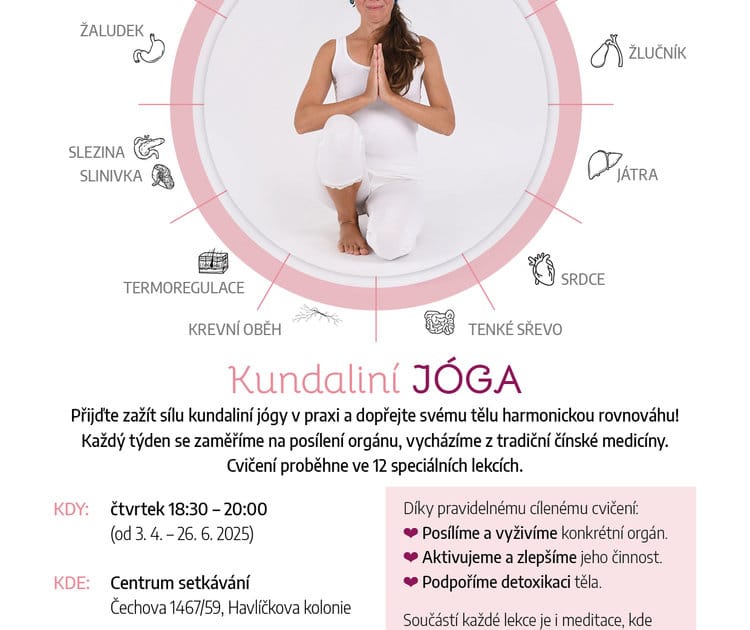Každý týden se zaměříme na posílení orgánu, vycházíme z tradiční čínské medicíny. Díky pravidelnému cílenému cvičení: – Posílíme a vyživíme konkrétní orgán. – Aktivujeme a zlepšíme jeho činnost. – Podpoříme detoxikaci těla. Součástí každé lekce je i meditace, kde aktivujeme sebeléčebný proces našeho těla pomocí meditace a mantry. Cvičení proběhne ve 12 speciálních lekcích. Kundaliní jóga obnovuje pružnost těla – páteře, harmonizuje hormonální systém, stimuluje žlázy s vnitřní sekrecí, čistí lymfatický systém, zklidňuje psychiku a posiluje imunitu. Na hodině zažijete radost z pohybu, spokojenost, sílu svého dechu a klid v mysli.