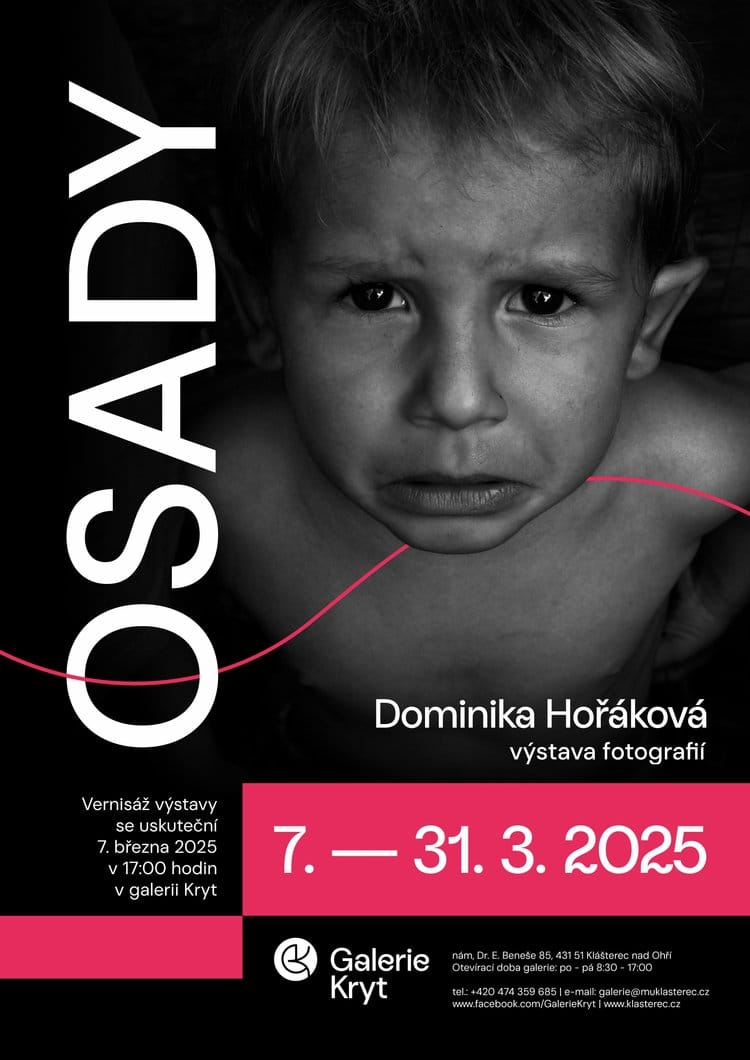 V galerii Kryt se v březnu představí Dominika Hořáková. Její výstava fotografií s názvem Osady představuje dokumentární fotografie z romských osad na Slovensku, kam v posledních letech opakovaně jezdí. Zachycuje každodenní život jejich obyvatel bez sentimentu a klišé. Cílem je nabídnout autentický pohled na tuto komunitu, který zůstává často nepovšimnutý nebo zkreslený. Fotografie vznikaly jak na kinofilm, tak i na digitální fotoaparát, což autorce umožnilo experimentovat s různými vizuálními přístupy, kombinovat tradici a moderní technologie a přitom zachovat syrovost a přirozenost momentu.