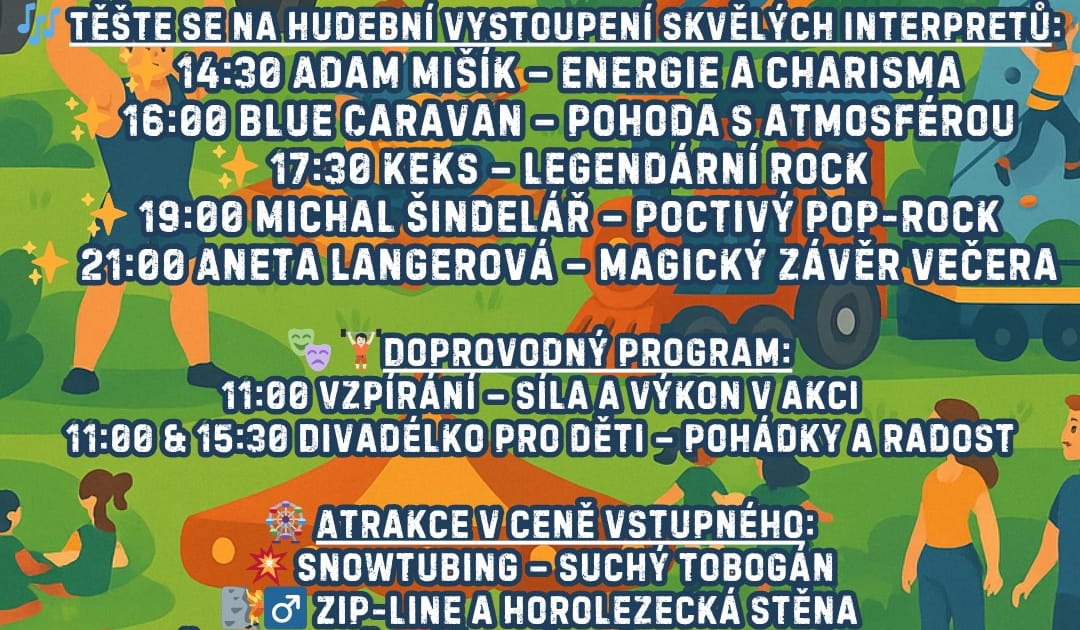 Atrakce v ceně vstupného: Snowtubing – suchý tobogán ♂️ Zip-line a horolezecká stěna Střelnice, překážková dráha, lanové aktivity Kolotoče, vláček, skákací hrady Malování na obličej, airbrush tetování Měření tlaku, občerstvení A večer… OHŇOSTROJ!