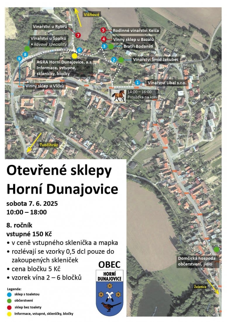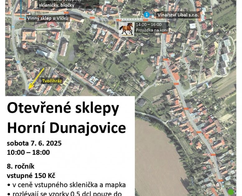 Vinaři z Horních Dunajovic zvou první červnovou sobotu do svých sklepů na ochutnávky vín, kde nebude chybět ani živá muzika, občerstvení nebo dokonce možnost projížděk na koni.