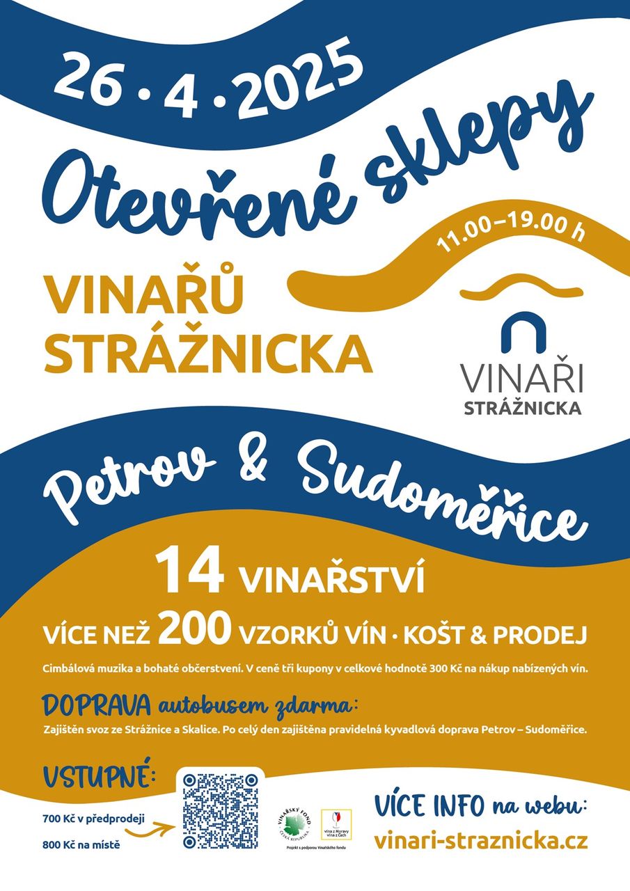 tak jako v předchozích letech jsme pro vás připravili velmi oblíbenou akci „Otevřené Sklepy Vinařů Strážnicka“. Akce ve spolupráci s Vinařským fondem české republiky se uskuteční v termínu 26.4.2025 od 11:00 do 19:00 hodin ve vinařských areálech obci Petrov a Sudoměřice. Svá vína a bohaté občerstvení pro vás připraví 14 vinařů a dohromady u nás ochutnáte více než 200 vzorků vín.