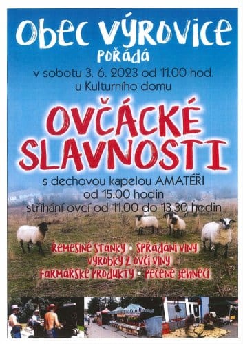 Slavnost zaměřená na tradiční ovčácké pastevectví a produkty s ním spojené. Od 11 o 18 hod. se ve Výrovicích na prostranství u kulturního domu těšte na stánky s řemesly, farmářské produkty, výrobky z ovčí vlny, pečené jehněčí, ukázku stříhání ovcí anebo na dechovou hudbu Amatéři z Dobšic (od 15 hod.).