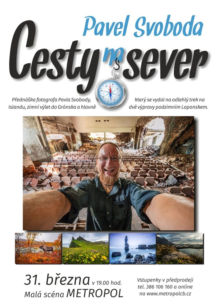 Cestovatelská přednáška z dílny fotografa a dobrodruha Pavla Svobody. Daleký evropský SEVER v sobě skrývá surovost přírody, melancholii nevyzpytatelného počasí, prostor pro outdoorové výpravy a zcela jistě i dávku návykovosti. Na Islandu se vydáme na dvoutýdenní trek po jednom z nejodlehlejších míst ostrova, poloostrově Hornstrandir. Zimní Grónsko byl splněný sen, jak vypadá život v inuitské vesnici? Čarokrásný podzim v Laponsku zvaný ruska vrcholí již během září, exploze sytých barev rozzářila severskou tundru. Dlouhé treky divočinou finského i švédského Laponska doprovázejí stáda sobů, rybaření a romantika v pohádkových srubech. Po nocích zatančí po severské obloze polární záře. Přijďte si užít vyprávění z několika dobrodružných cest, které nadchne každého milovníka drsného severu a divoké přírody. Pavel Svoboda (*1985) je vystudovaný geograf žijící svůj sen jako fotograf na cestách. Barvitý vypravěč a autor populárních cestopisných projekcí. Na cestách po Asii, Jižní Americe a evropském severu strávil již několik let života. Milovník vysokých hor, odlehlých regionů a málo známých destinací. Příběhy velkých půlročních cest představil v knižních publikacích Napříč Jižní Amerikou a Napříč Asií, nyní přichází se svojí třetí knihou s názvem Horští tuláci.