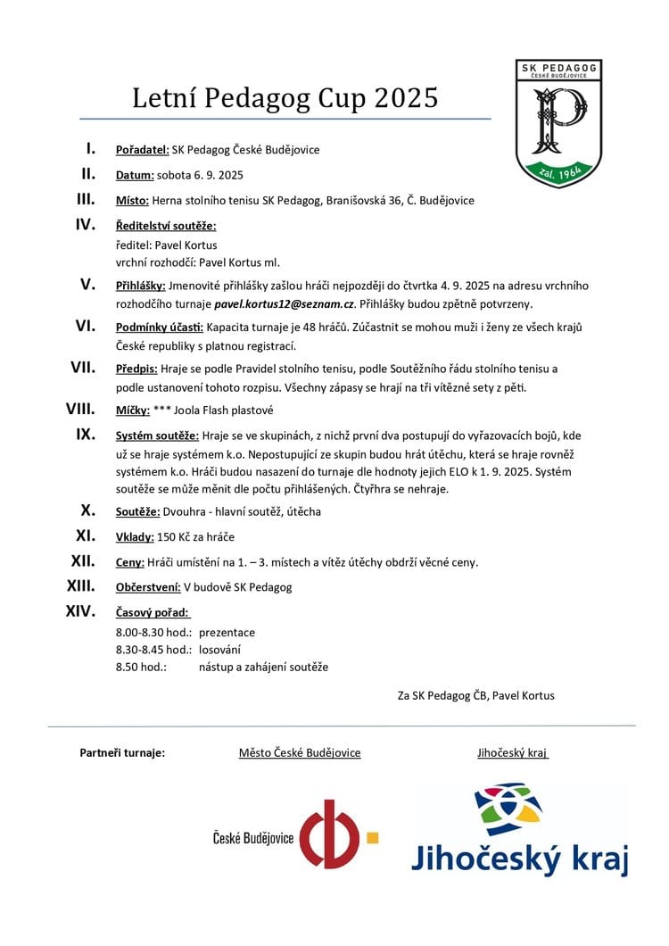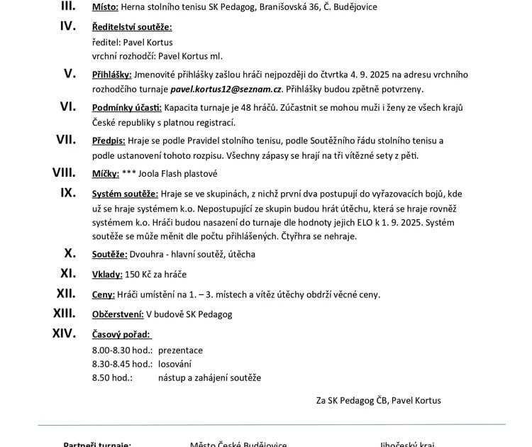 Osvědčený systém turnaje se nemění. Hraje se ve skupinách, po kterých následuje hlavní soutěž a útěcha. Čtyřhry se nehrají. Turnaj jako každoročně slibuje zajímavé hráčské obsazení předních stolních tenistů z Jihočeského kraje i hostů z dalších koutů České republiky.