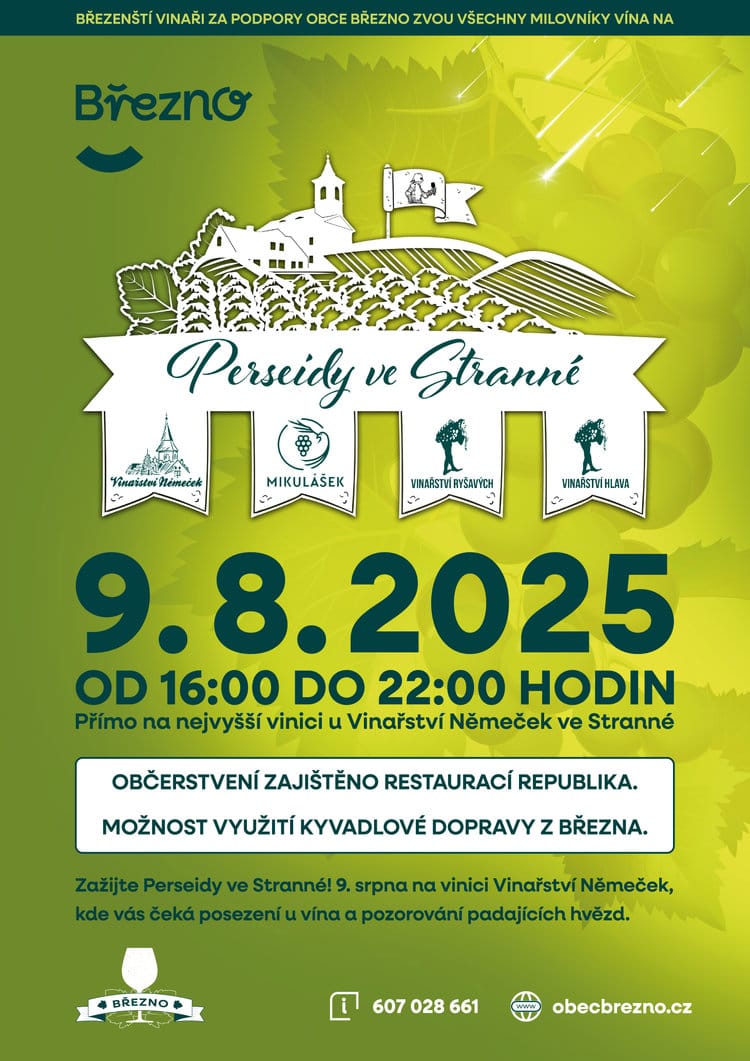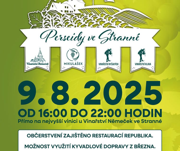 Zveme všechny milovníky vína na pozorování Perseid a posezení u vína dne 9. srpna 2025 od 16:00 do 22:00 na nejvyšší vinici u Vinařství Němeček ve Stranné. Občerstvení zajišťuje Restaurace Republika. Zajištěna kyvadlová doprava z Března.