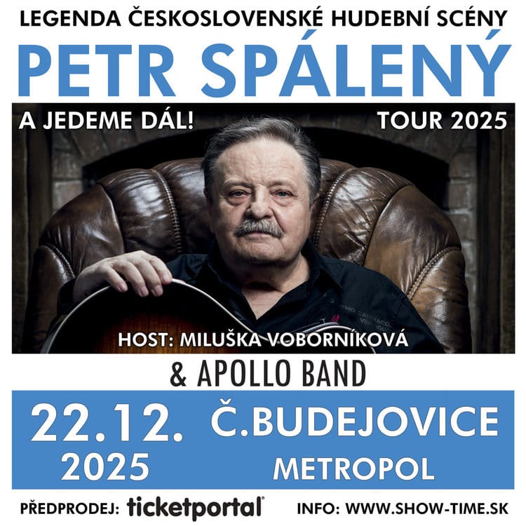 Petr Spálený – hudební skladatel, kytarista, flétnista, bubeník, ale především zpěvák – je legendou československé hudební scény, na níž je úctyhodných 55 let. Petr se žánrově etabloval na pomezí rocku, country a pop music a v současnosti vystupuje s kapelou Apollo a stálým a vzácným hostem Miluškou Voborníkovou – zpěvačkou a manželkou v jedné osobě. Po loňském úspěšném narozeninovém turné k jeho osmdesátinám se Petr Spálený rozhodl pokračovat v koncertování i v roce 2025 a velmi se potěší, stanete-li se součástí jeho koncertu i Vy!