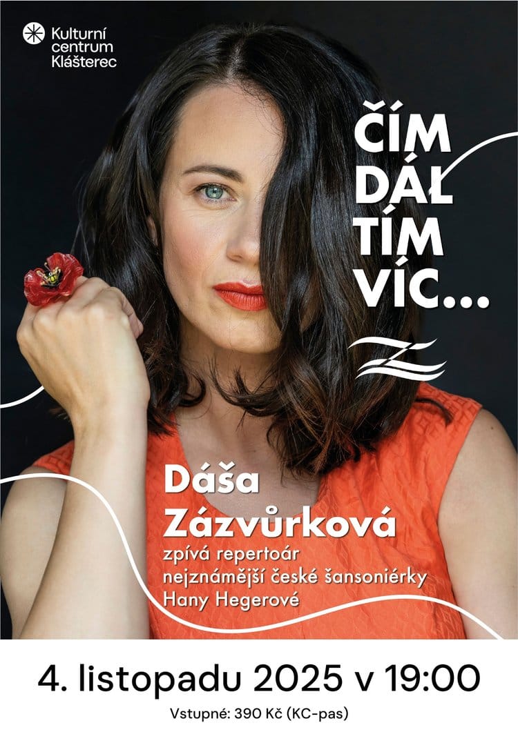 Čím dál, tím víc…Přijďte si vychutnat nezapomenutelný večer s Dášou Zázvůrkovou, která vás zavede do světa šansonu! Zazní písně od nejslavnější české šansoniérky Hany Hegerové.