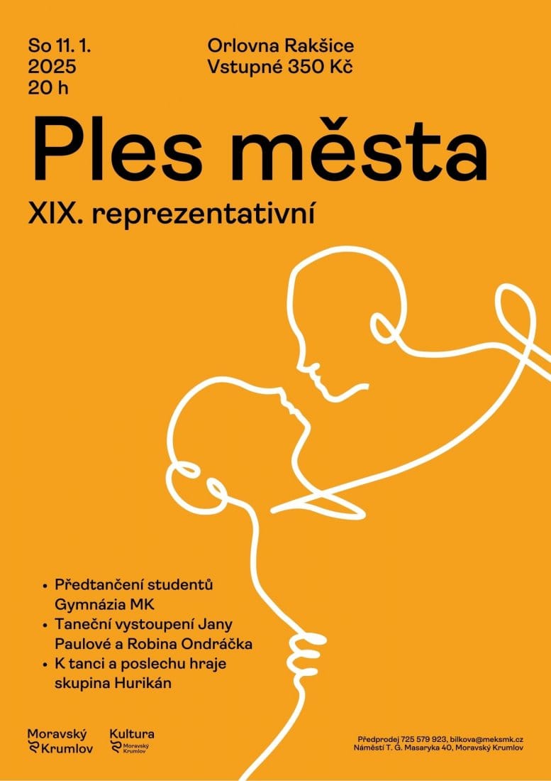 XIX. Reprezentační ples města Moravský Krumlov proběhne druhou lednovou sobotu v Orlovně v Rakšicích, na jižním předměstí Moravského Krumlova. Od 20 hod. hraje k tanci i poslechu živá hudba (skupina Hurikán) a chybět nebude ani předtančení studentů Gymnázia Moravský Krumlov. O působivé taneční vystoupení se postarají herečka Jana Paulová a tanečník Robin Ondráček, účastníci posledního ročníku oblíbené televizní soutěže Star Dance.
