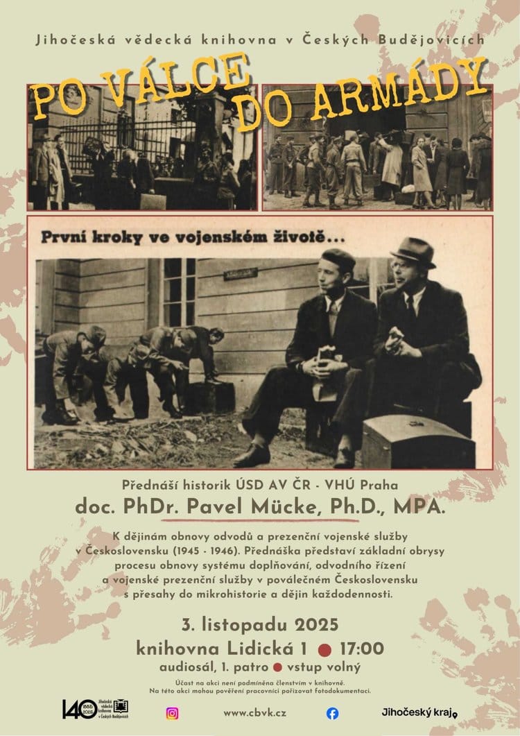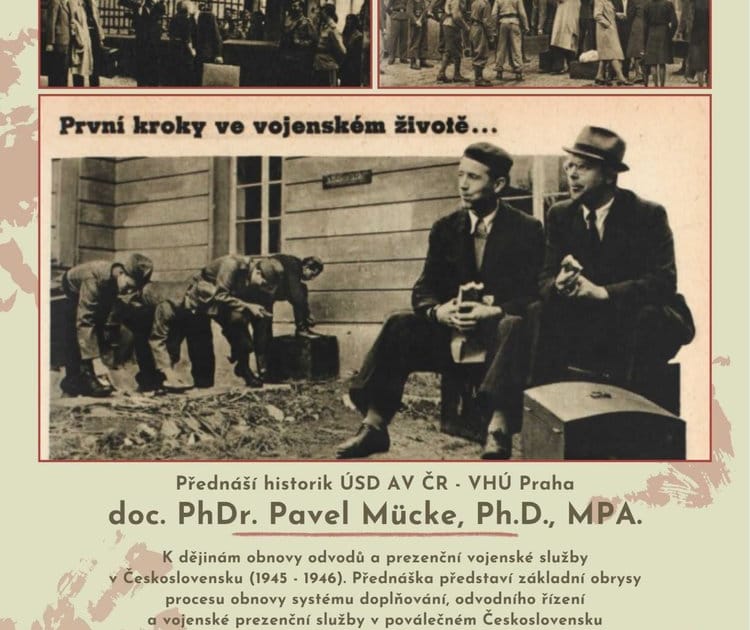 K dějinám obnovy odvodů a prezenční vojenské služby v Československu (1945 – 1946). Přednáška představí základní obrysy procesu obnovy systému doplňování, odvodního řízení a vojenské prezenční služby v poválečném Československu s přesahy do mikrohistorie a dějin každodennosti. Přednáší doc. PhDr. Pavel Mücke, Ph.D., MPA (historik – ÚSD AV ČR – VHÚ Praha – Policejní akademie ČR)
