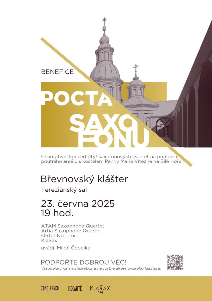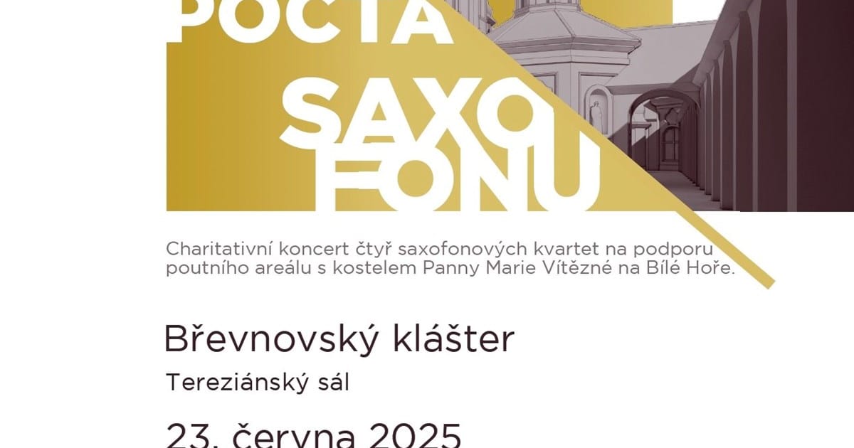 Unikátní koncert čtyř saxofonových kvartet na podporu poutního místa Panny Marie Vítězné na Bílé Hoře. Zazní i společná skladba pro 16 saxofonů, napsaná přímo pro tuto akci.