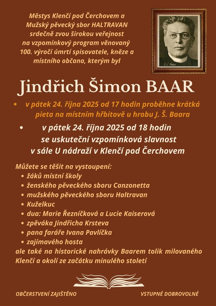 V pátek 24. října 2026 uplyne přesně 100 let od úmrtí českého katolického kněze, básníka a spisovatele Jindřicha Šimona Baara. Po krátké pietě, která proběhne od 17 hodin na hřbitově v Klenčí pod Čerchovem, kde je slavný rodák a občan Klenčí pohřben, je od 18 hodin připravena v kulturním sále vzpomínková slavnost. Srdečně zveme všechny příznivce historie, literatury a místní tradice!
