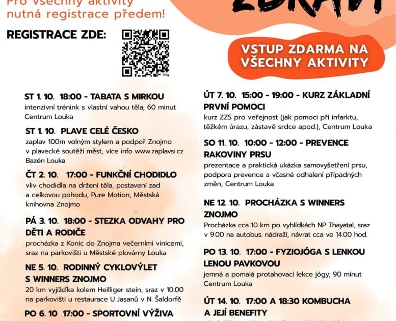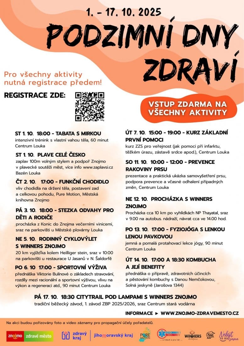 Oblíbené Podzimní Dny zdraví přinášejí do Znojma aktivní dny plné sportu, procházek, běhu nebo tance. Chybět nebude ani program pro děti. Zdravé město Znojmo tak zve všechny příznivce pohybu a zdravého životního stylu letos celkem na 12 akcí pro veřejnost. Program je sestaven tak, aby korespondoval s daným období roku a byl sestaven pro všechny věkové kategorie. Všechny akce jsou zdarma, ale je nutná rezervace míst předem.