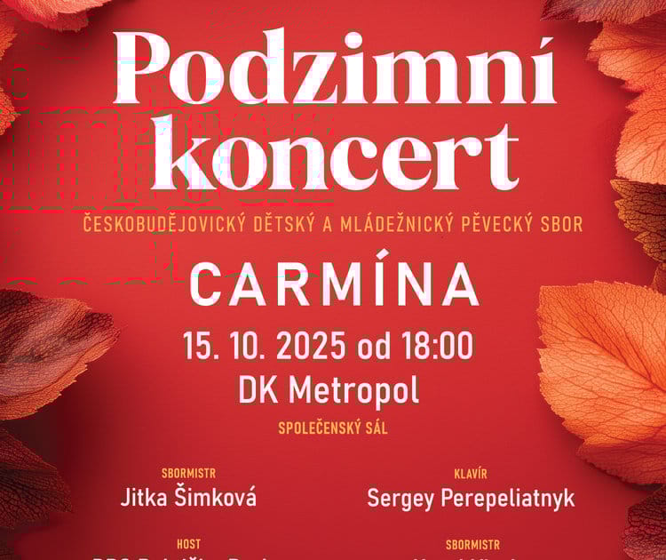 Srdečně Vás zveme na Podzimní koncert Českobudějovického dětského a mládežnického pěveckého sboru CARMÍNA. Vystoupí všechna oddělení pod vedením sbormistryně Jitky Šimkové a koncertního klavíristy Sergee Perepeliatnyka.