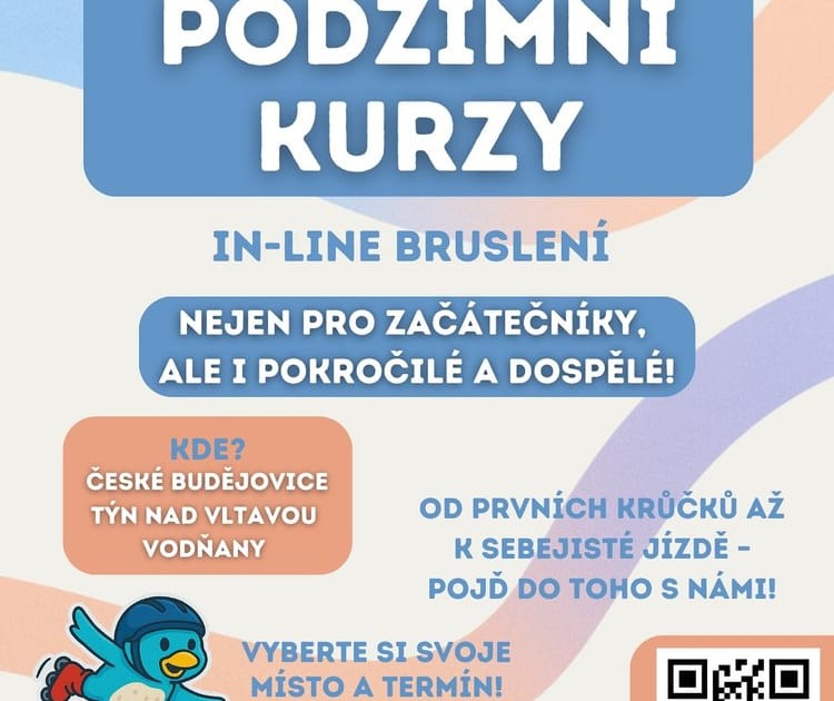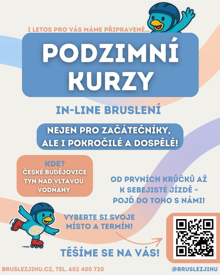 Podzimní kurzy inline bruslení jsou tu a my se moc těšíme, až se znovu potkáme na kolečkách. Jezdit budeme v Českých Budějovicích, Vodňanech a Týně nad Vltavou.