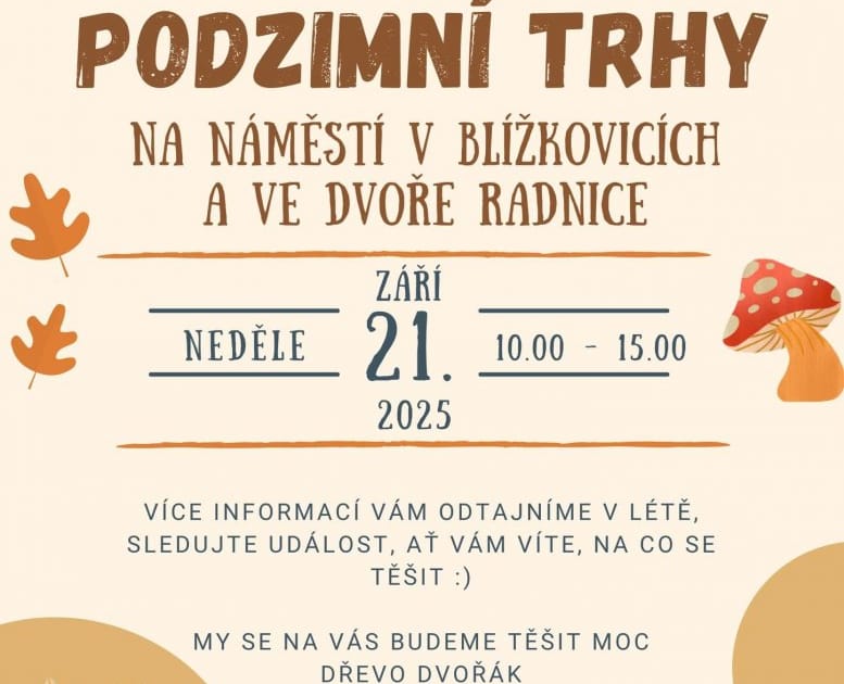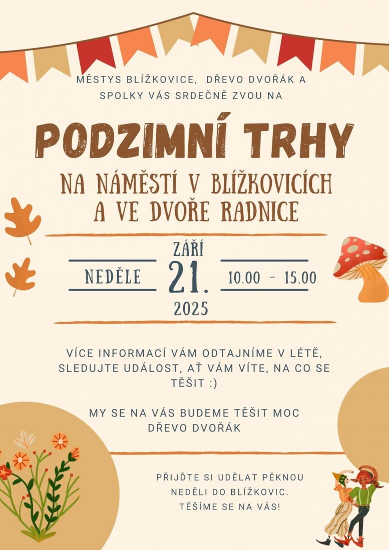 Náměstí v Blížkovicích zaplní od 10 do 15 hod. oblíbené řemeslné trhy s ručně vyráběnými výrobky, regionálními produkty a bohatým občerstvením. Součástí akce je i příjemné posezení s živou muzikou nebo dílničky pro děti.
