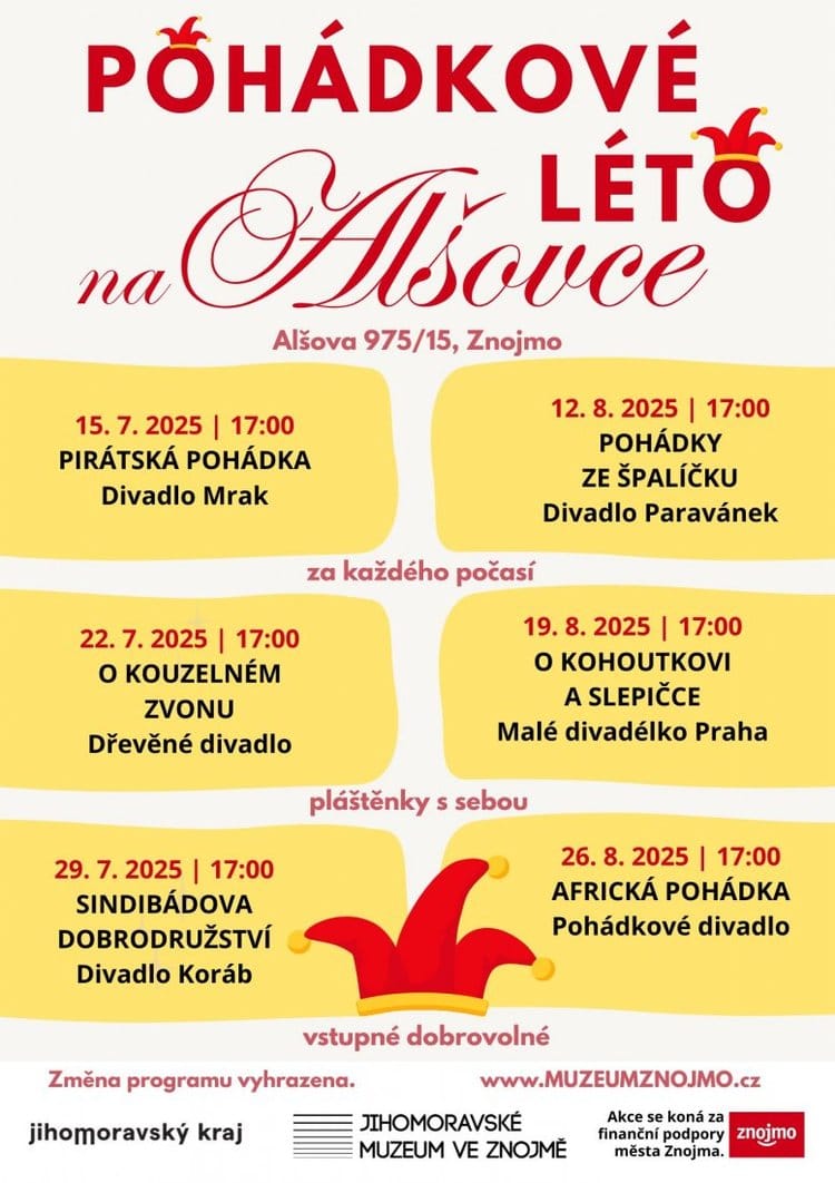 Divadelní představení pro nejmenší probíhají v období prázdnin v nové budově Jihomoravského muzea na Alšovce ve Znojmě, a to ve vybrané úterky odpoledne, vždy od 17 hod. Pokaždé se představí jiná divadelní společnost s jinou pohádkou, 26. srpna to bude AFRICKÁ POHÁDKA od Pohádkového divadla. Představení se hraje za každého počasí. Vstupné dobrovolné.