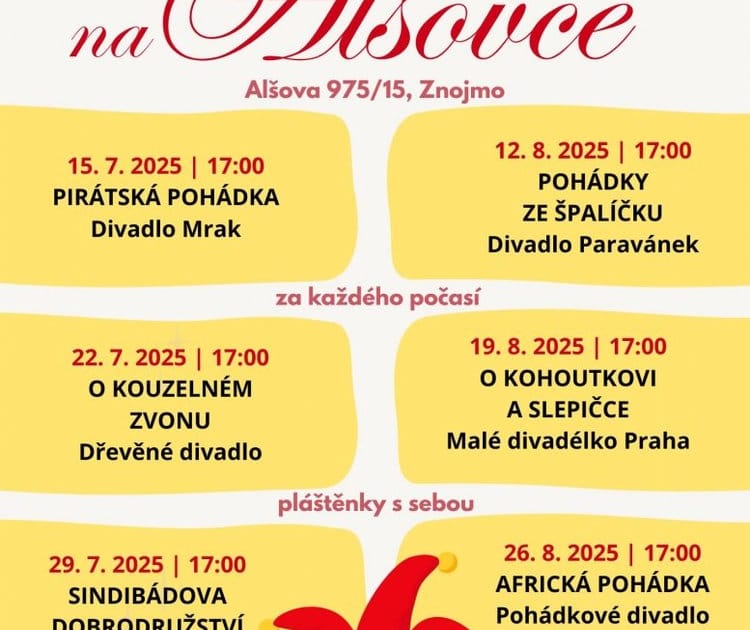 Divadelní představení pro nejmenší probíhají v období prázdnin v nové budově Jihomoravského muzea na Alšovce ve Znojmě, a to ve vybrané úterky odpoledne, vždy od 17 hod. Pokaždé se představí jiná divadelní společnost s jinou pohádkou, 19. srpna to bude pohádka O KOHOUTKOVI A SLEPIČCE od pražského Malého divadélka. Představení se hraje za každého počasí. Vstupné dobrovolné.