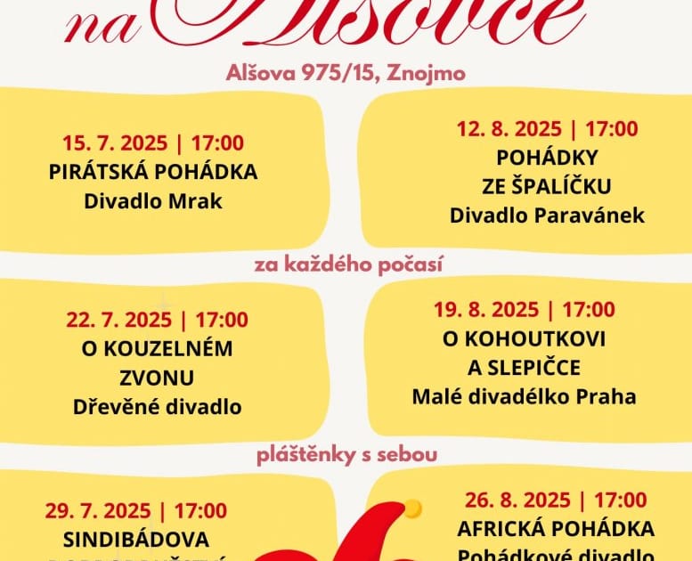 Divadelní představení pro nejmenší probíhají v období prázdnin v nové budově Jihomoravského muzea na Alšovce ve Znojmě, a to ve vybrané úterky odpoledne, vždy od 17 hod. Pokaždé se představí jiná divadelní společnost s jinou pohádkou, 22. července to bude pohádka O KOUZELNÉM ZVONU od Dřevěného divadla. Představení se hraje za každého počasí. Vstupné dobrovolné.