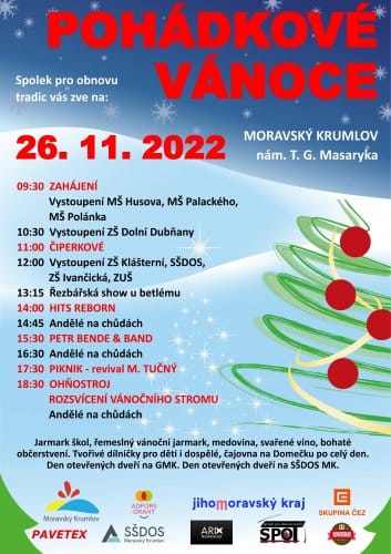 Oblíbené přátelské setkávání občanů města na náměstí TGM s nabídkou bohatého doprovodného programu pro všechny generace i s občerstvením. Nedílnou součástí je vždy nově nastudovaná pohádka, koncerty domácích hudebních těles i českých hudebních hvězd. Celodenní program odstartuje už v 9:30 hod. a zakončí jej slavnostní ohňostroj a rozsvícení vánočního stromu v 18:30 hod.