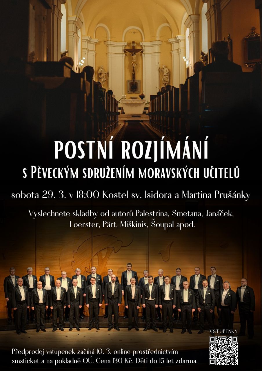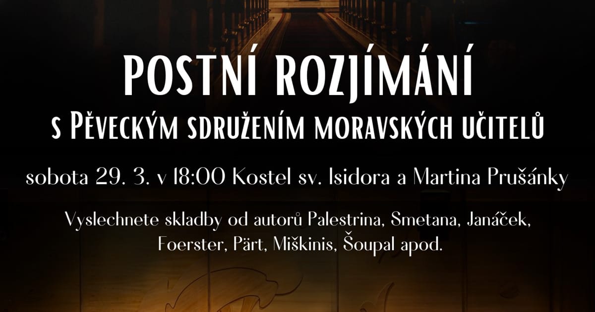 Doba postní vybízí k rozjímání nad sebou samým a nad otázkami toho, co nás převyšuje. Pěvecké sdružení moravských učitelů nabídne posluchačům prostor ponořit se do duchovních skladeb významných autorů v nádherných prostorách kostela sv. Isidora, které umocní hloubku spirituálního prožitku z koncertu.