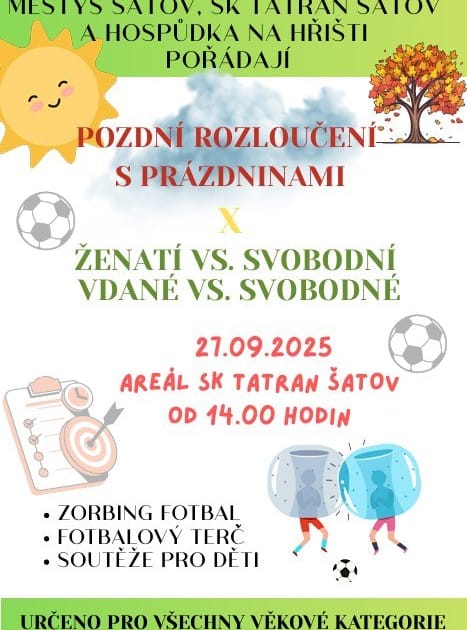 Na zábavné odpoledne pro velké i malé, které je pořádáno jako opožděné rozloučení s létem a prázdninami, můžete dorazit do Šatova. Budou zde připraveny aktivity pro děti i sportovní klání v několika disciplínách. V utkáních zorbing fotbalu budou soutěžit družstva mužská (ženatí versus svobodní), ale také bude připravena i ženská kategorie (vdané versus svobodné). Během odpoledne bude zajištěno i občerstvení. Akce se koná v areálu SK Tatran Šatov od 14 hod.