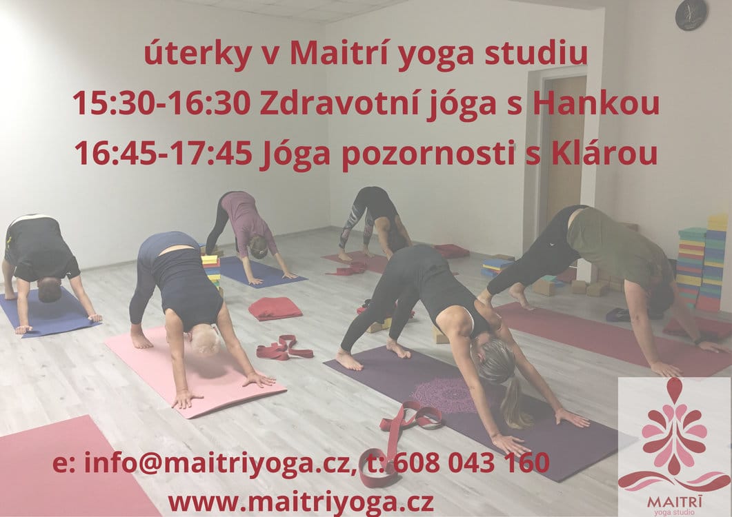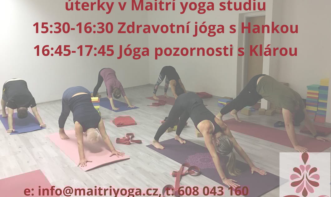 Srdečně zveme všechny zájemce o jógu na pravidelné úterní lekce v Maitrí. Začínáme 15.30-16.30 Zdravotní jógou s Hankou Šebestovou, která je určena jak pro začátečníky, tak mírně pokročilé, je zaměřena na správné anatomické nastavení těla a využívá moderních poznatků o konstrukci pohybového aparátu. Pokračujeme 16.45-17.45 Jógou pozornosti s Klárou Radevovou pro úplné a věčné začátečníky. Záměrem je znovunapojení se na své tělo, na cítění toho, co se v něm děje, o navázání komunikace s ním a tím nastartování jeho samoléčebných procesů. Obě lektorky jsou zkušené, mají dlouholetou vlastní praxi i dlouholetou praxi v předávání hlubokého učení jógy dále. Lekce můžete navštěvovat jako kurz nebo flexibilní permanentku nebo na jednorázové vstupné.