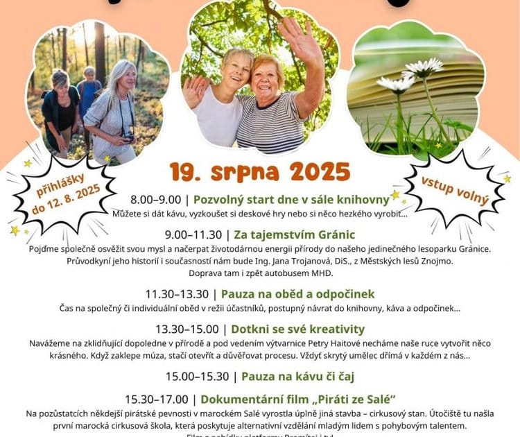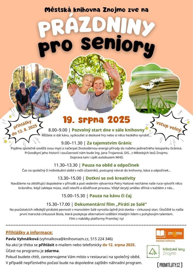 Celodenní prázdninový program plný aktivit určený pro seniory. Během dne bude na programu komentovaná vycházka Gránicemi s průvodcem na které pak navazuje kreativní odpoledne s výtvarnicí. Program završí promítání dokumentu Piráti ze Salé o marocké cirkusové škole pro mladé s pohybovým talentem. Prázdniny pro seniory jsou pořádány zdarma, je však nutné se na akci přihlásit dopředu, a to do 12. srpna. Přihlásit se můžete osobně v městské knihovně u p. Vyhnálkové, na telefonním čísle 515 224 346 či e-mailem: vyhnalkova@knihovnazn.cz.