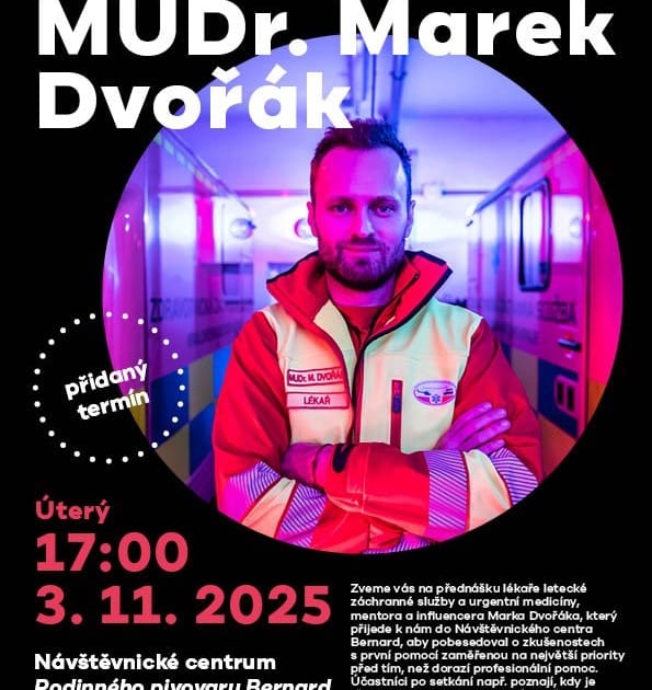 Lékař letecké záchranné služby a urgentní medicíny, mentor a influencer MUDr. Marek Dvořák přijede k nám do Návštěvnického centra Bernard, aby pobesedoval o zkušenostech s první pomocí zaměřenou na největší priority před tím, než dorazí profesionální pomoc.