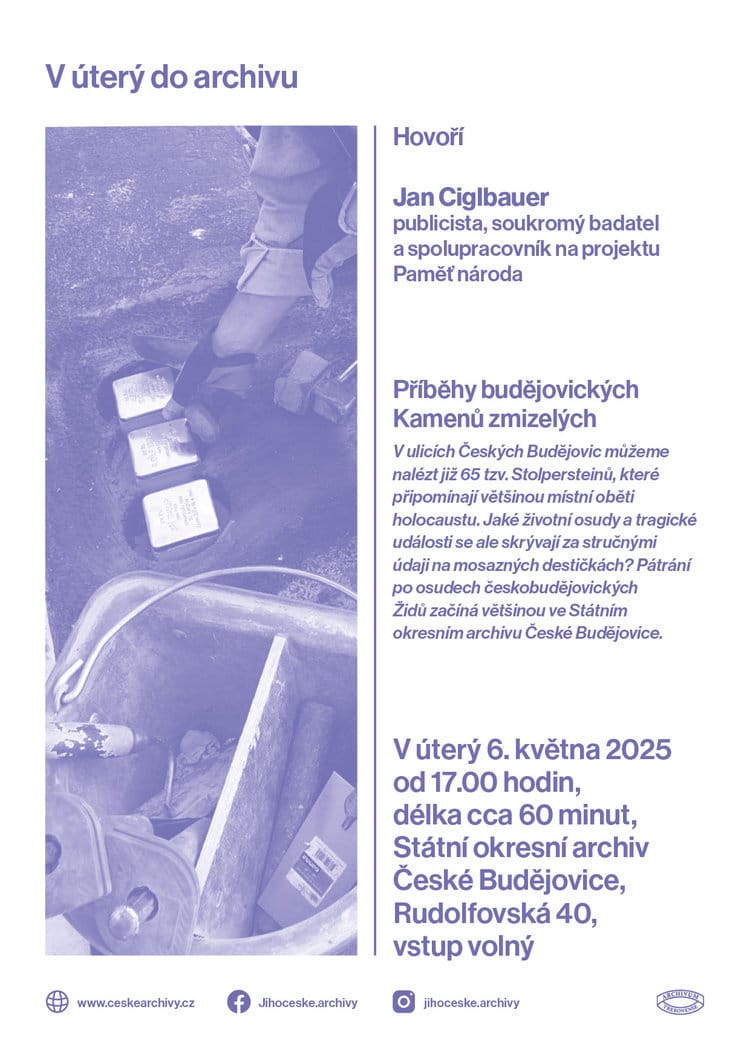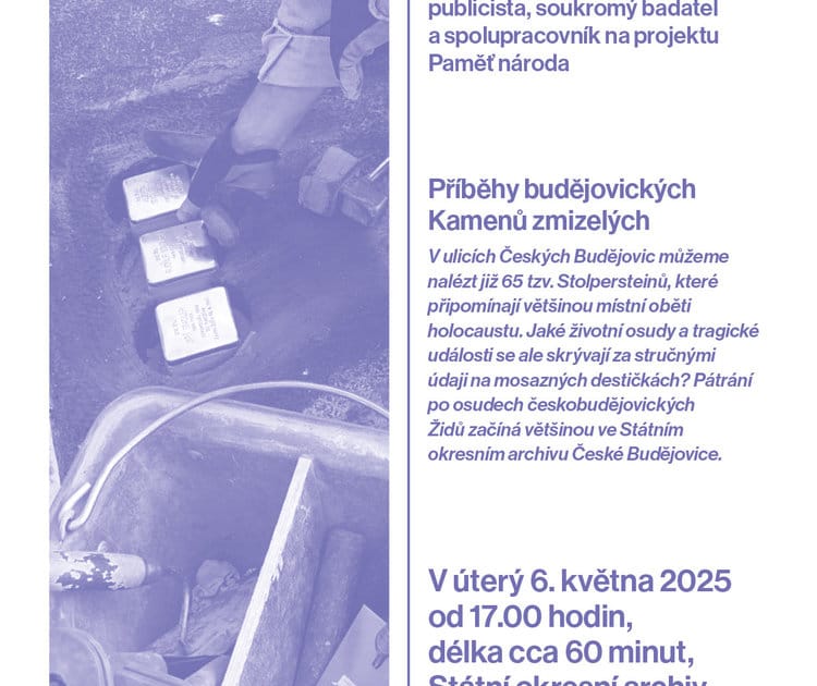 V ulicích Českých Budějovic můžeme nalézt již 65 tzv. Stolpersteinů, které připomínají většinou místní oběti holocaustu. Jaké životní osudy a tragické události se ale skrývají za stručnými údaji na mosazných destičkách? Pátrání po osudech českobudějovických Židů začíná většinou ve Státním okresním archivu České Budějovice.