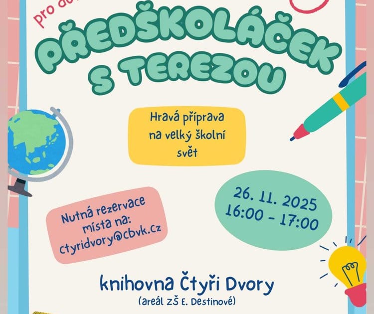 Hravá příprava na velký školní svět. Pro děti 4+. Nutná rezervace místa na ctyridvory@cbvk.cz