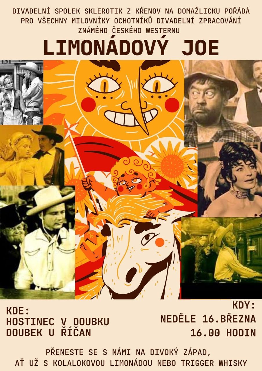 Divadelní spolek Sklerotik z Křenov na Domažlicku vás srdečně zve na jedinečné divadelní představení legendární české komedie Limonádový Joe. Přijďte se s námi přenést do zapadlého městečka Stetson City, kde se neohrožený hrdina s kolty proklatě nízko a lahví Kolalokovy limonády v ruce snaží nastolit pořádek. Čeká vás strhující příběh plný napětí, humoru a nezapomenutelných postav. Zažijete souboje, přestřelky a romantické zápletky, které vás nenechají vydechnout. Nechte se unést skvělými hereckými výkony místních ochotníků, dobovými kostýmy a autentickými kulisami. Ať už si dáte Kolalokovu limonádu nebo Trigger whisky, zábava je zaručena!